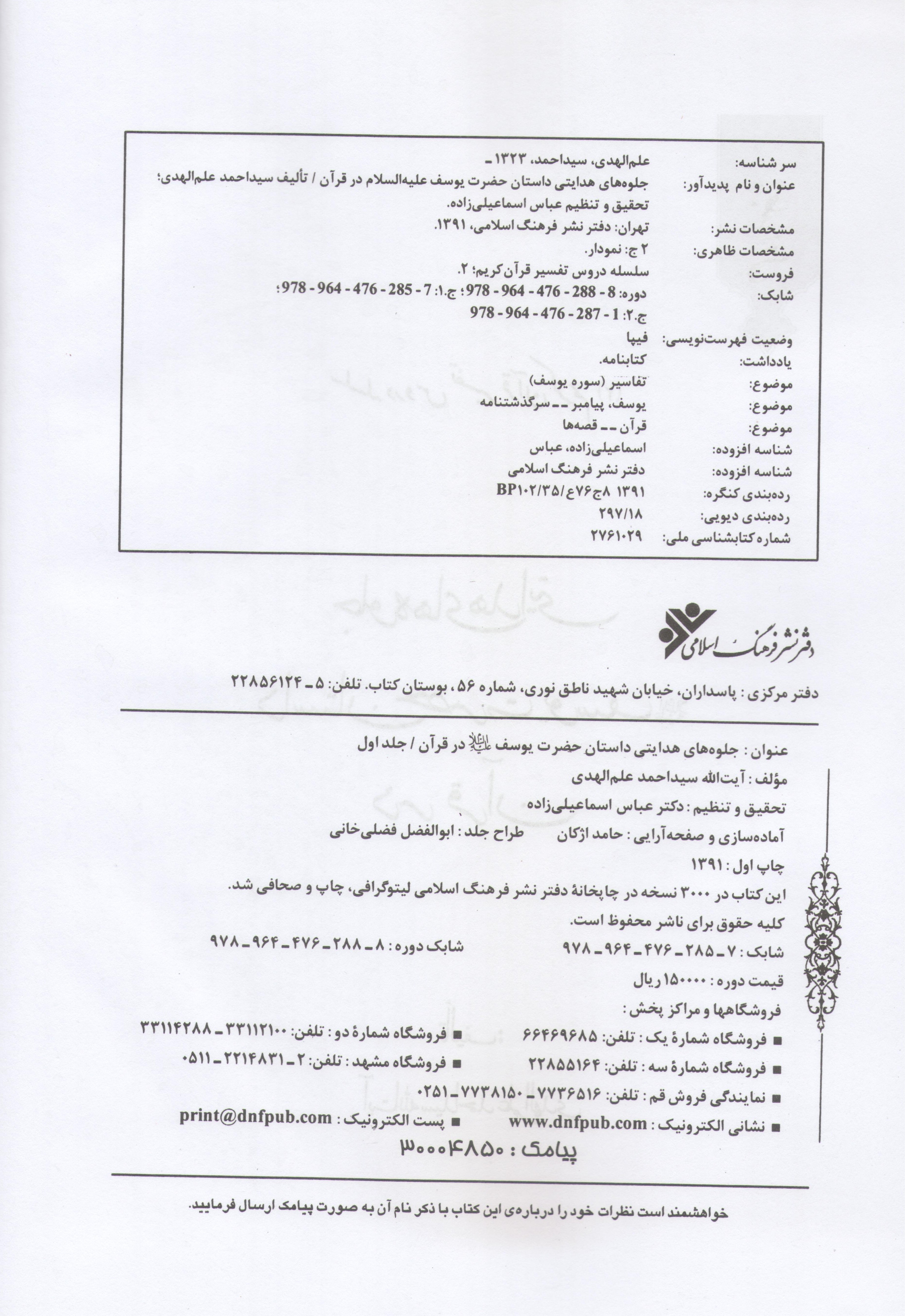عنوان : جلوه های هدایتی داستان حضرت یوسف (علیه السلام) در قرآن / جلد اول و دوم