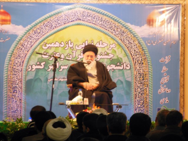 آیتالله علمالهدی صبح امروز، 14 بهمنماه در مراسم افتتاحیه یازدهمین دوره جشنواره قرآن و عترت بسیج دانشجویی سراسر کشور که در دانشگاه علوم اسلامی رضوی مشهد برگزار شد، با بیان اینکه دهه فجر امسال تعلق خاصی به ساحت امام زمان(عج) دارد زیرا این ایام حد فاصل بین شهادت و ولادت پدر بزرگوارشان است،بیان داشتند: برگزاری این جشنواره نیز با محوریت توجه به ساحت امام حسن عسکری(ع) در شهر مشهد از حساسیت و موضوعیت خاصی برخوردار است